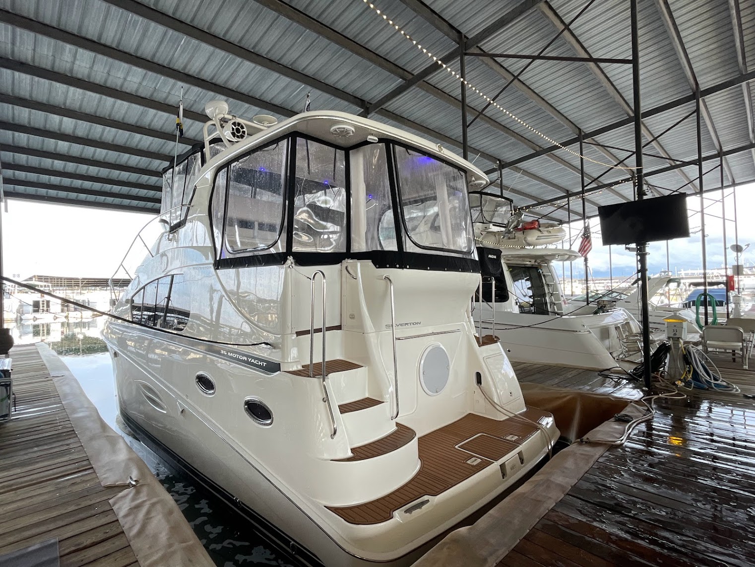 Aft-deck mounted TV, great for watching the game or morning news out on the hook.